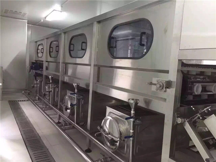 2、该设备适用5加仑瓶使用(也可适用3加仑瓶,但需提供样瓶),该设备集洗瓶、灌装、套盖、压盖和成品送出为一体。洗瓶机采用多道洗涤液喷射和消毒液喷射,达到洗涤、消毒的目的,消毒液可以循环使用。封口机可以自动封口,输送瓶盖过程口配有卫淋装置,以确保瓶盖无菌清洁。