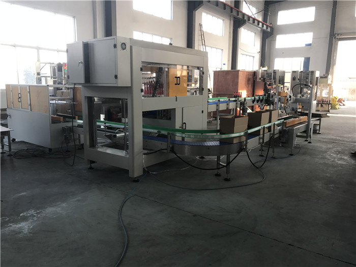 本机是一种智能性全自动装箱机,采用高速分配装置包装各种容器,包装塑料扁瓶、圆瓶、不规则形瓶,各种大小玻璃瓶,圆瓶、椭圆形瓶、方形罐及纸罐等,另外也适用于带隔板的包装箱。由瓶夹(内置橡胶,以防损伤瓶体)夹住瓶体,放入打开的纸箱当中,当抓头抬起时,将纸箱排出,送至封箱机,本机采用P.L.C +触摸显示屏控制。设有缺瓶报警停机,无瓶不装箱安全装置。大大减少生产人员和劳动强度,是自动化规模生产必不可缺少的设备。